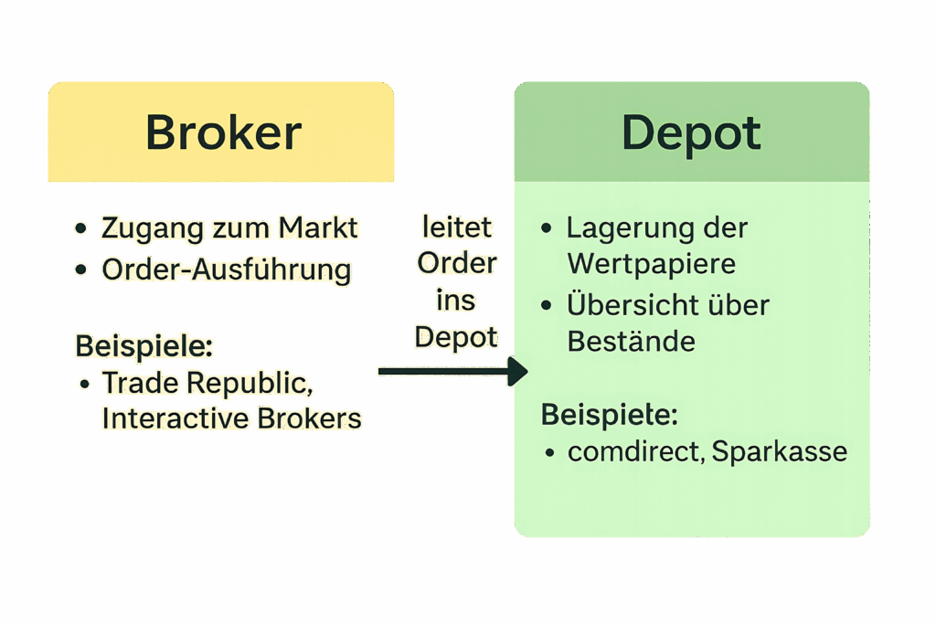 - Broker und Depot gehören untrennbar zusammen, auch wenn sie unterschiedliche Aufgaben erfüllen. Der Broker ist dein Zugang zum Markt: Er führt deine Kauf- oder Verkaufsaufträge aus und sorgt dafür, dass sie am richtigen Handelsplatz landen. Das Depot dagegen ist die digitale Lagerstelle, in der deine Wertpapiere verwahrt werden. Ohne Broker gäbe es keinen Handel – ohne Depot keine sichere Aufbewahrung.